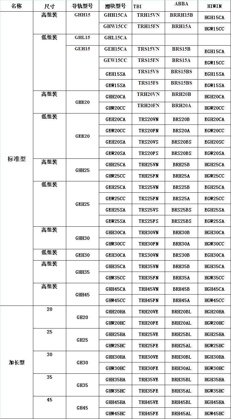 GE系列分為非互換性及互換性型兩種線性滑軌,兩者規格尺寸相同,主要差異點在于互換性型之滑塊、滑軌可單獨互換使用,較便利,但其組合精度無法達到非互換性型之超精密級以上的精度,不過由于互換性型之組合精度目前已達到一定的水平,對不需配對安裝線性滑軌的客戶而言,是一項便利的選擇。 GE線性滑軌的產品規格型號主要標明線性滑軌尺寸、型式、精度等級、預壓等規格要求,以利訂貨時雙方對產品的確認。